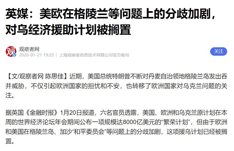 由于欧洲和美国在格陵兰岛、加沙“和平委员会”等问题上的分歧加剧,这项援乌计划已经被搁置。